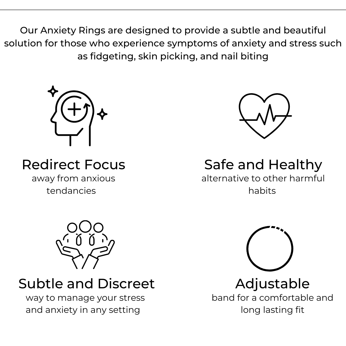 Our Anxiety Rings are thoughtfully created to offer a subtle way to cope with stress and anxiety related habits such as fidgeting, skin picking, hair pulling, and nail biting.